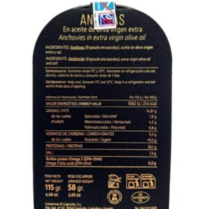 Ingredientes: Filetes de Anchoa del Cantábrico Engraulis encrasicolus, aceite de oliva y sal.
