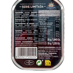 Bocarte del Cantábrico capturado al alba, de manera que pasan menos de ocho horas hasta su llegada a la lonja. Posteriormente, las anchoas de conservas Codesa, se someten a un proceso de curación en Sal Marina, no de cantera, por un tiempo medio de un año.
