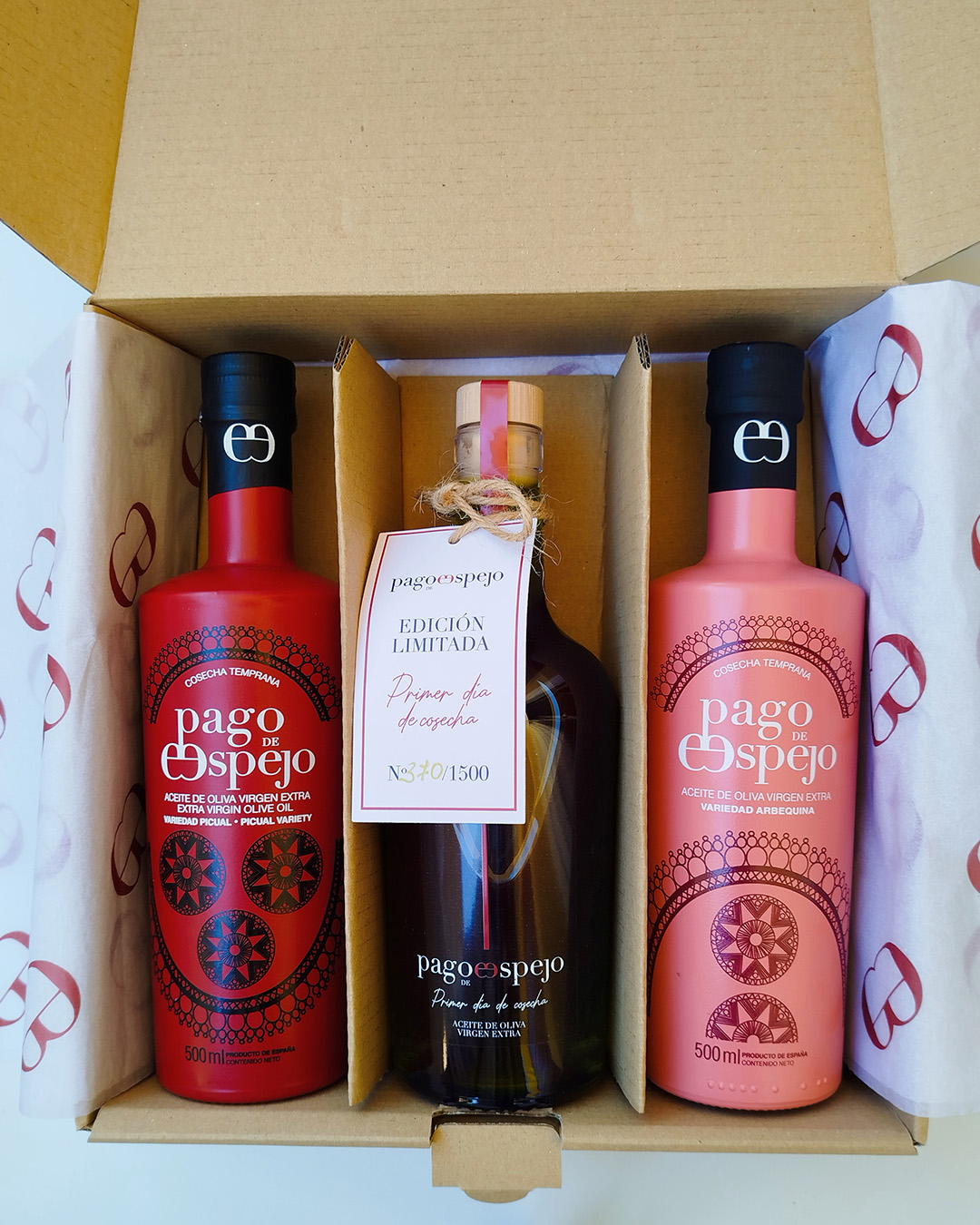 Pack exclusivo de Pago de Espejo con una botella de cada uno de sus tres aceites top: Primer Día de Cosecha, Picual y Arbequina. Tres estilos, un mismo origen, pensados para maridar cada plato según la ocasión.