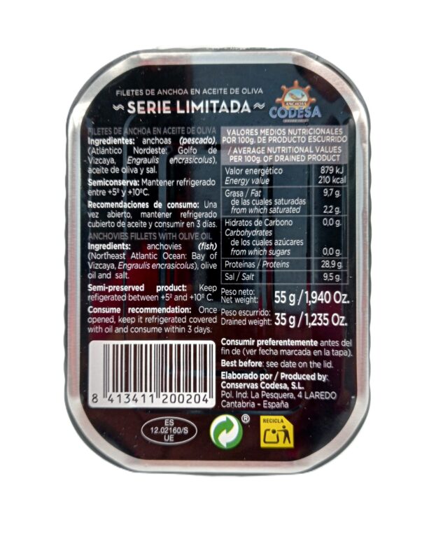 La Serie Limitada de anchoas Codesa está elaborada con la selección de los mayores calibres de Bocarte/boquerón selecciónados en las capturas del alba adquiridas en los puertos marineros del Cantábrico en los meses de Abril y Mayo, momento en el que el Bocarte/Boquerón alcanza su máxima calidad para la elaboración del Salazón, que permanecerá curando en bodega por una media de un año. Posteriormente es elaborado en apetitosos filetes de forma totalmente artesanal donde sólo una pocas expertas manos fileteras cántabras podrán mimarlas y elaborarlas en pequeñas producciones limitadas donde la máxima calidad prevalecerá sobre la cantidad. Por último serán abrazadas por uno de los mejores Aceite de Oliva Virgen Extra medalla de oro al mejor aceite del mundo 2012, que harán un maridaje perfecto para los paladares mas exigentes.