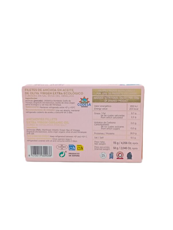Por otro lado, Codesa utiliza para curar sus anchoas la sal más pura, libre de contaminación y rica en hierro, calcio y magnesio que existe. La Sal Rosa del Himalaya, donde los peces permanecen durante unos doce meses antes de ser limpiados a mano y fileteados, está extraída de océanos fósiles primitivos y proporciona múltiples beneficios para la salud. No sólo contribuye a la mineralización adecuada de los huesos, sino que ayuda a prevenir calambres musculares o a regular el contenido de agua en el cuerpo y los fluidos internos.