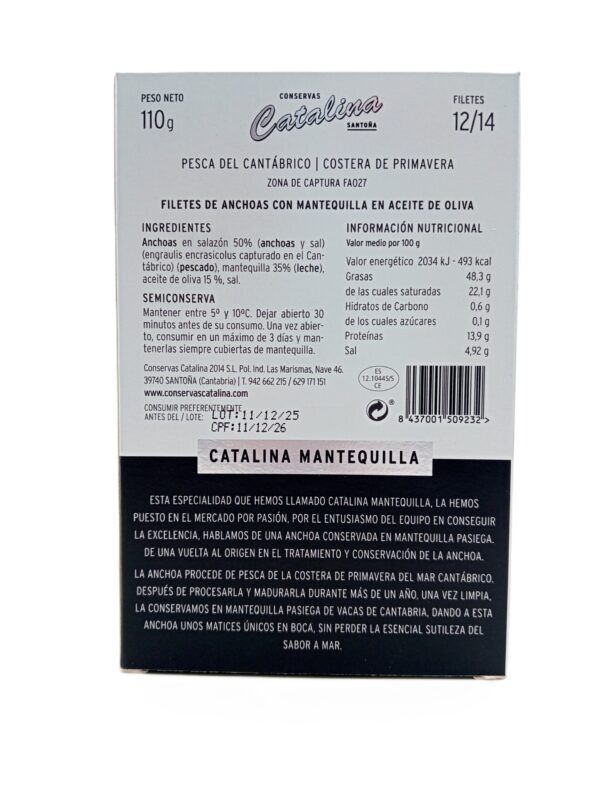 Estas anchoas de conservas Catalina han sido elaboradas con pesca cuidadosamente seleccionada de las capturas de primavera en el Mar Cantábrico. Trabajadas de forma artesanal, a mano, meticulosamente de una en una, son de un mayor calibre, y su color, sabor, textura y punto de sal las diferencia en el paladar. Y además, como las anchoas primigenias, en mantequilla.