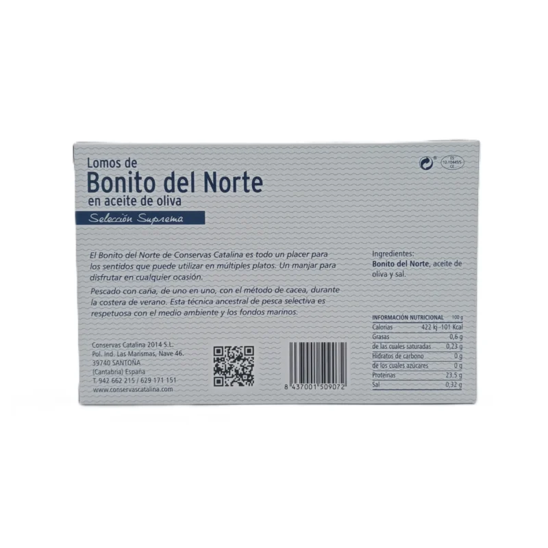 La producción de la lata de lomos de Bonito del Norte en aceite de oliva de Conservas Catalina 160 grs es limitada y a mano, en temporada, por lo que su consumo es aún más preciado. Sólo con las mejores materias primas, es decir, capturas de la flota cántabra realizadas en temporada (costera, en los meses estivales). La forma de pescarlo también influye. El arte de pesca usado por nuestros barcos, es el anzuelo. En este arte tradicional de pesca, los bonitos son pescados de uno en uno, con el esfuerzo de nuestros marineros, de esta forma la carne del pez no es golpeada o arañada con las redes.