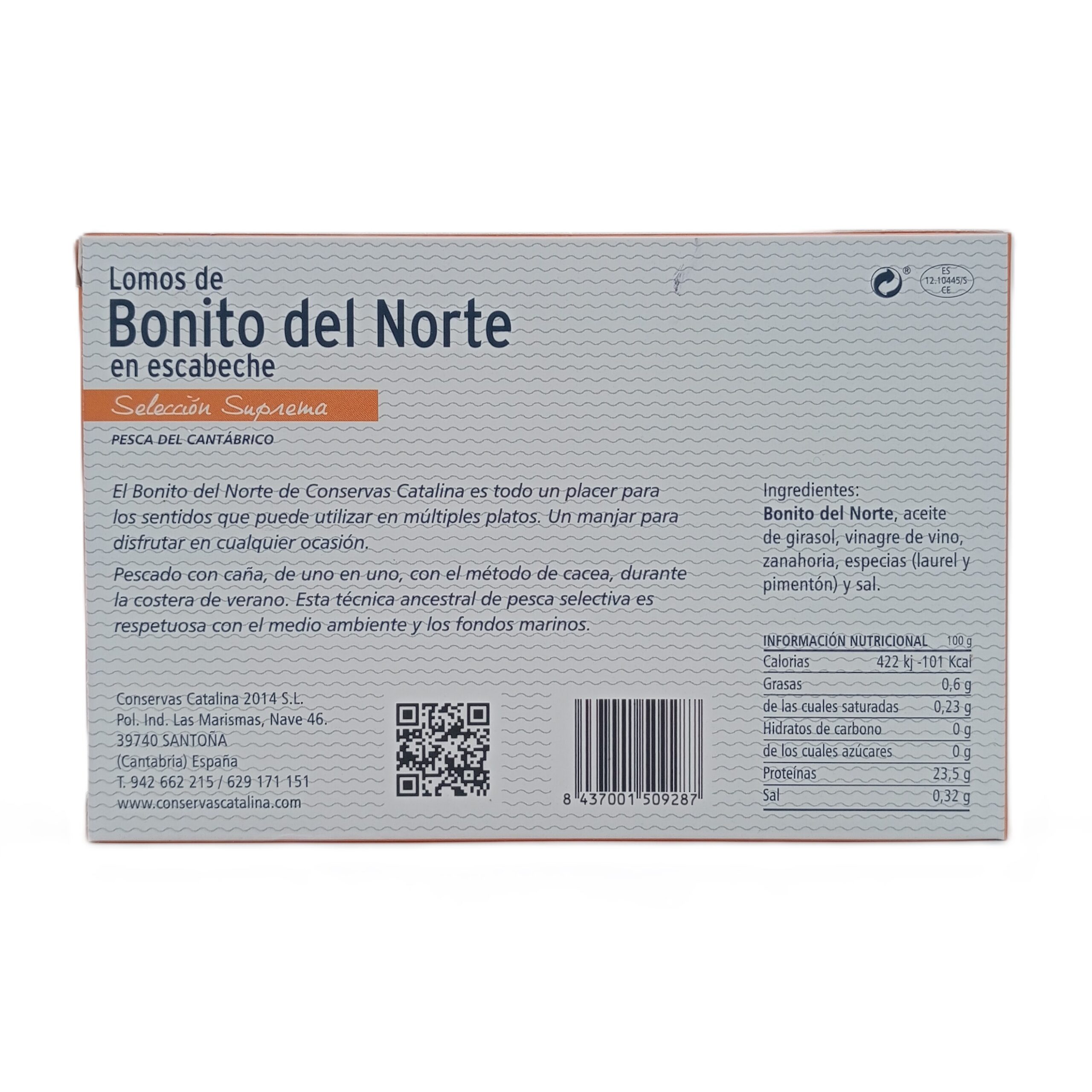 El bonito utilizado para elaborar esta lata de lomos de bonito en escabeche Conservas Catalina es pescado en las costeras del mar Cantabrico por las flotas del mismo, siendo su captura de forma artesanal, pescado a anzuelo, generando un equilibrio sostenible en el ecosistema y beneficiándose así de que la captura del bonito es la mejor calidad.