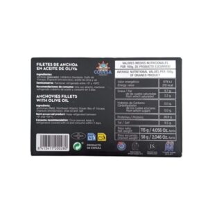 Ingredientes: Filetes de Anchoa del Cantábrico Engraulis encrasicolus, aceite de oliva y sal.