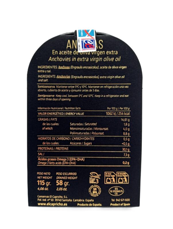 Anchoas El Capricho. Elaboradas artesanalmente. Alto contendido de ácidos grasos Omega 3. Con aceite de oliva Virgen Extra de Castillo de Canena de la variedad arbequina.