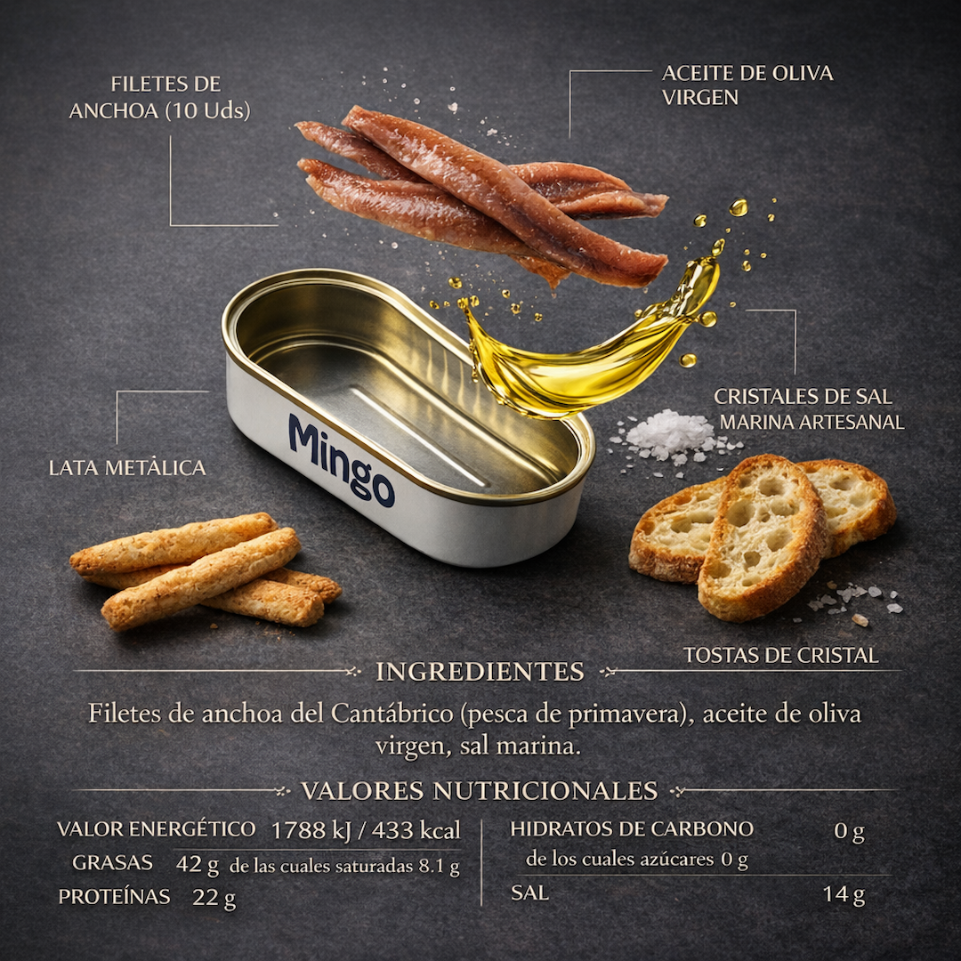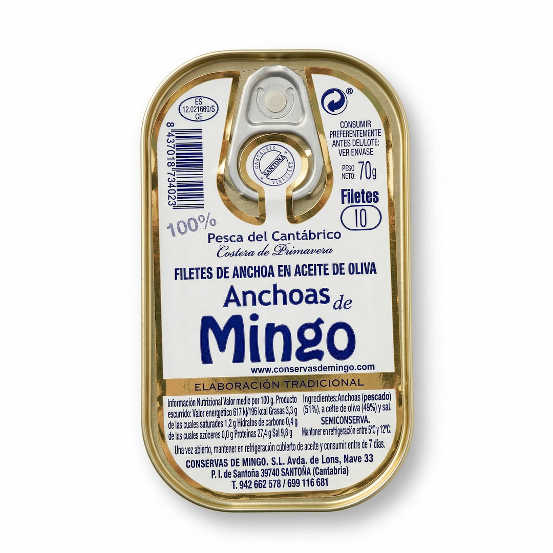 Para elaborar la Lata de Anchoas del Cantábrico 10 filetes de Conservas Mingo solo se utiliza bocarte de la más alta calidad, y se ofrece completamente limpio de espinas con un sabor y una textura que harán las delicias de los paladares más exigentes.
