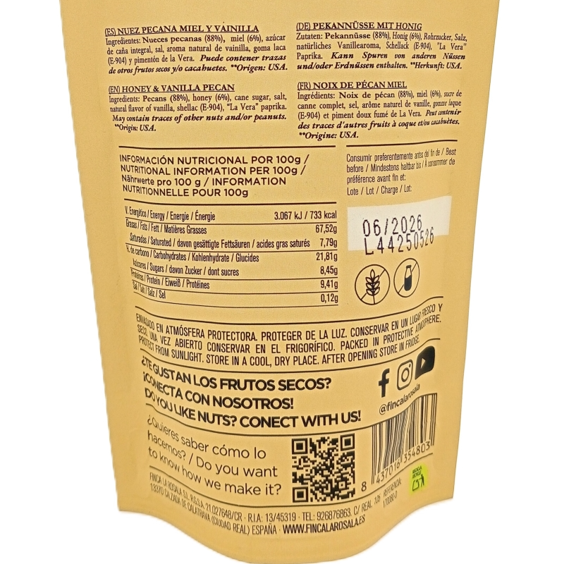 Además, nos preocupamos por las personas con intolerancias alimentarias. Por eso, estas pecanas con Miel y Vainilla son libres de gluten y lactosa, convirtiéndose en una opción segura y deliciosa para disfrutar en cualquier momento.