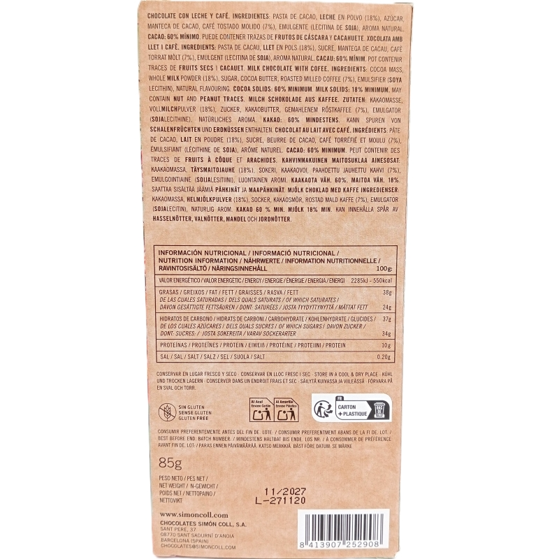 Chocolate 85 gr Leche 60 % Cacao Cappuccino SIMON COLL