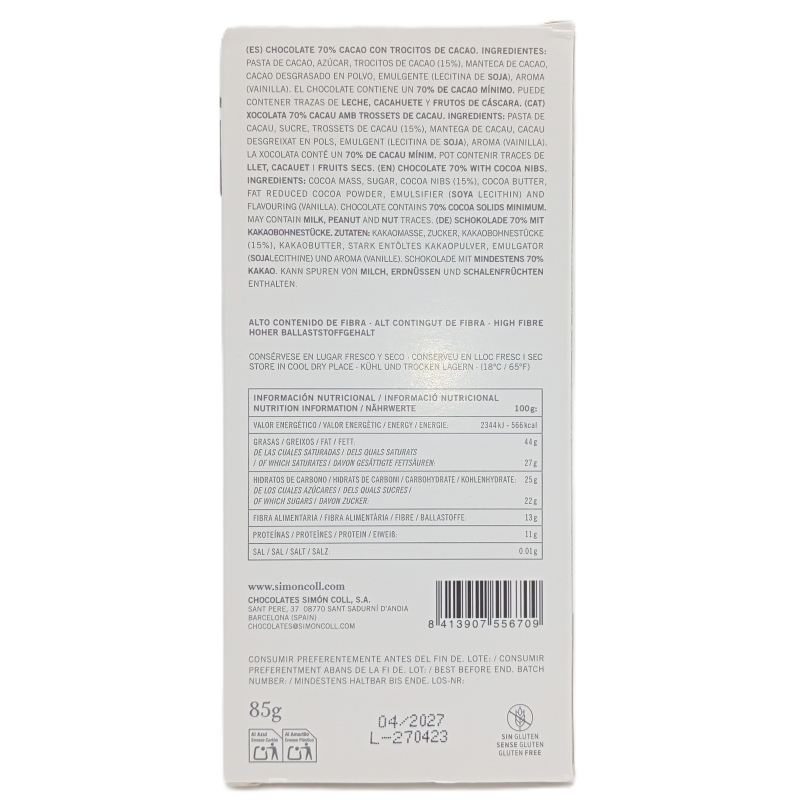 Chocolate Simon Coll 70 % cacao con nibs 85 grs