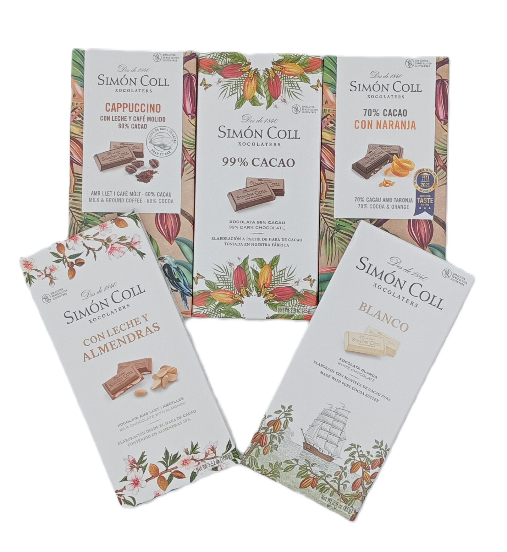 Sumérgete en un viaje de placer con este exclusivo kit de chocolates Simón Coll. Diseñado para los amantes del cacao, incluye una selección cuidadosamente elaborada de sabores que conquista todos los paladares: chocolate blanco cremoso, chocolate negro 99% intenso, chocolate con leche y almendras crujientes, chocolate con cappuccino aromático y chocolate con naranja fresca.