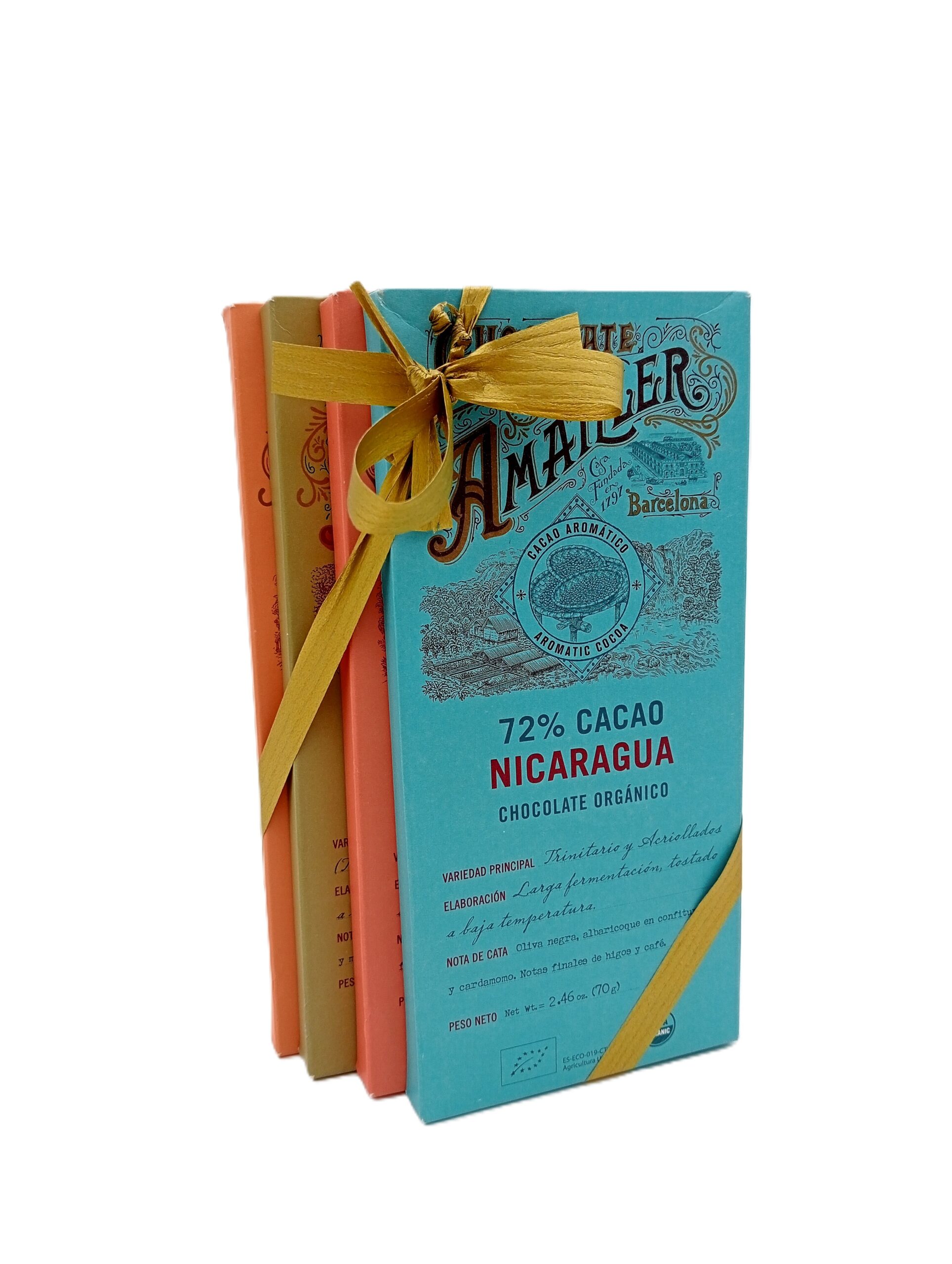 Contenido: 2 tabletas de 70g (Ecuador 85% y Ghana 85%), 2 chocolatinas de 18g (Ecuador 70% y Ghana 70%) y una lata de Amatllons de 35g.