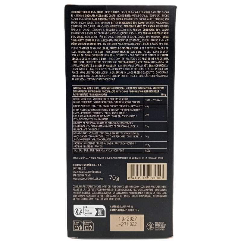 Elaborado con un 85% de habas de cacao origen único Ecuador, y azúcar. Ya puedes disfrutar en casa de este fabuloso chocolate amatller.