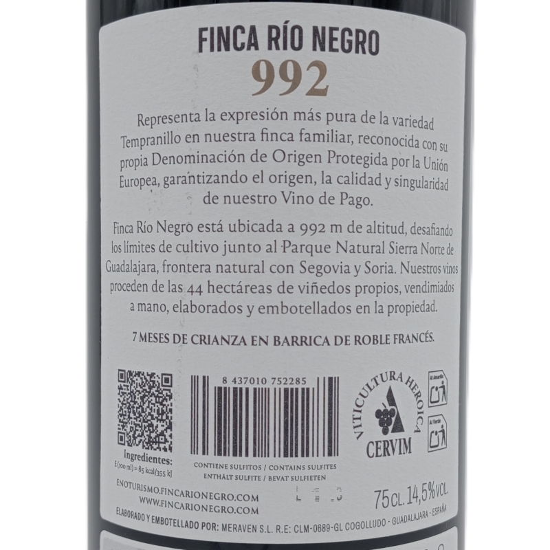 El 992 Finca Río Negro es un vino tinto de alta gama elaborado en viñedos situados a casi 1.000 metros de altitud. Este entorno extremo aporta una personalidad única, marcada por la frescura, la concentración y la elegancia.