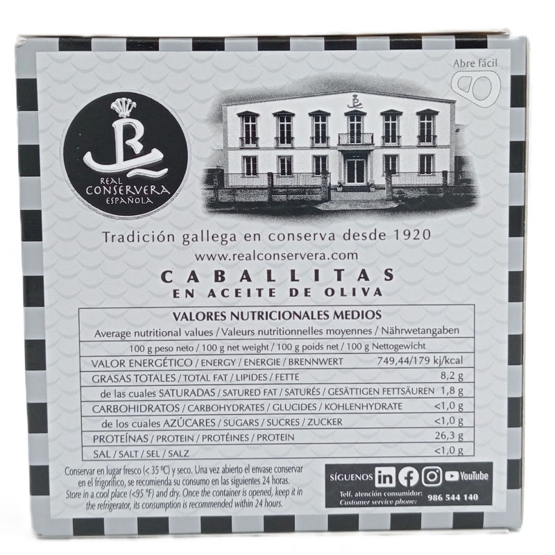 Las Caballitas Real Conservera Española son una auténtica joya del mar elaborada con una de las materias primas más apreciadas por su sabor suave y su textura jugosa. Seleccionadas cuidadosamente y tratadas con mimo, estas caballitas destacan por su carne fina, tierna y llena de matices.