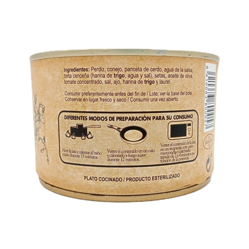 Ingredientes Perdiz, conejo, panceta de cerdo, agua de la salsa, torta cenceña (harina de trigo) agua y sal) setas, aceite de oliva, tomate concentrado, sal ajo, harina de trigo y laurel. VALORES NUTRICIONALES % IR Valor medio por 100 gramos Valor energético 0,00 Kj/kcal. 0,00 Grasas: 5,60 de las cuales: Saturadas 1,30 gramos Monoinsaturadas 0,00 gramos Poliinsaturadas 0,00 gramos Hidratos de carbono: 8,30 Kj/kcal. 0,00 de los cuales: Azúcares 0,60 gramos Polialcoholes 0,00 gramos Almidón 0,00 gramos Proteinas: 5,20 gramos 0,00 Sal: 0,80 gramos 0,00 Fibra: 0,00 miligramos 0,00 Vitaminas: 0,00 nanogramos 0,00 Alérgenos Trigo Condiciones de conservación Conservar en lugar fresco y seco. Fabricante Conservas Huertas