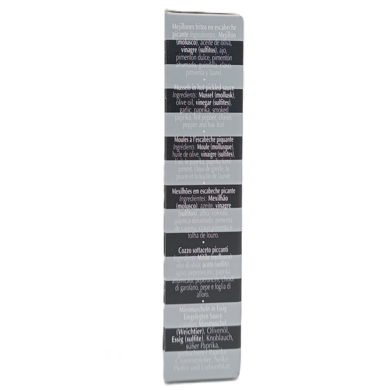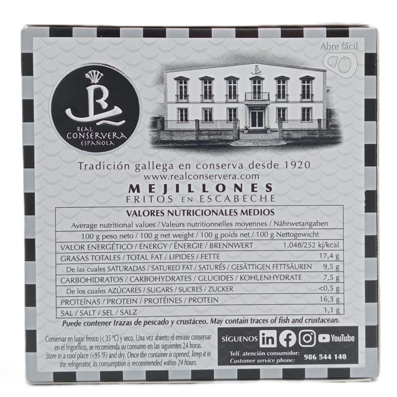 Mejill?n (molusco), aceite de oliva, vinagre (sulfitos), ajo, piment?n dulce, piment?n ahumado, clavo, pimienta y laurel. molusco, sulfitos, puede contener trazas de pescado y crust?ceosIngredientes VALORES NUTRICIONALES % IR Valor medio por 100 gramos Valor energético 0,00 Kj/kcal. 2,00 Grasas: 17,40 de las cuales: Saturadas 9,50 gramos Monoinsaturadas 0,00 gramos Poliinsaturadas 0,00 gramos Hidratos de carbono: 7,50 Kj/kcal. 0,00 de los cuales: Azúcares 0,00 gramos Polialcoholes 0,00 gramos Almidón 0,00 gramos Proteinas: 16,30 gramos 0,00 Sal: 1,10 gramos 0,00 Fibra: 0,00 miligramos 0,00 Vitaminas: 0,00 nanogramos 0,00 Alérgenos molusco, sulfitos, puede contener trazas de pescado y crustáceos Condiciones de conservación Conservar en lugar fresco y seco Fabricante