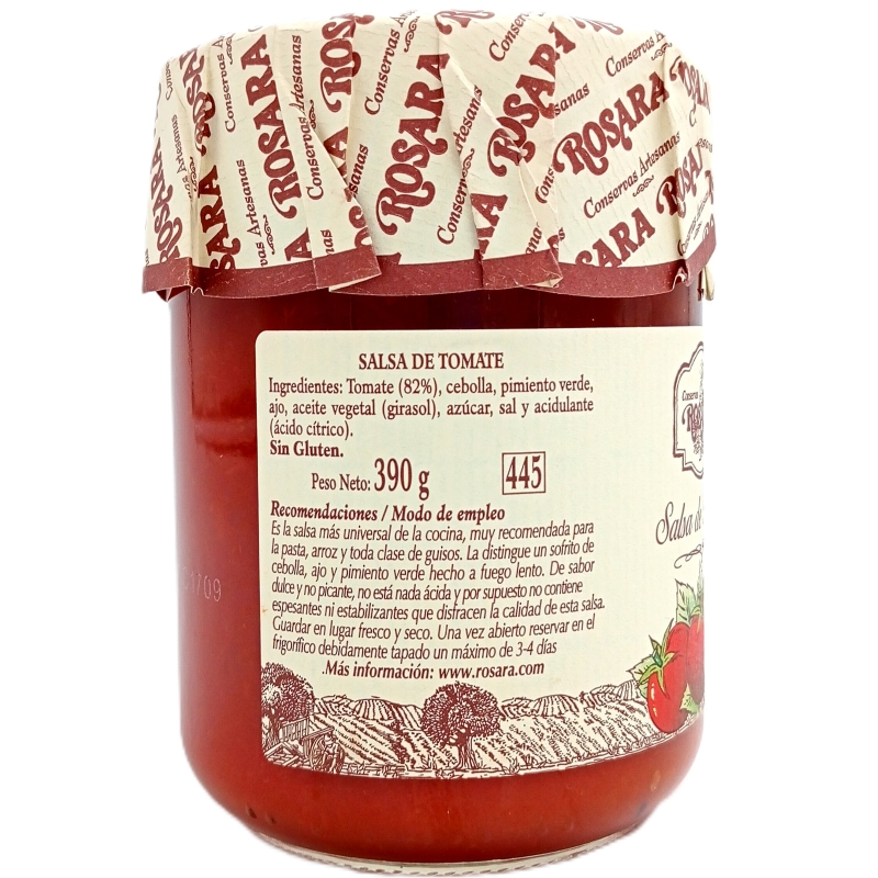 La salsa de tomate Rosara sin duda uno de los productos estrella de la marca. Una salsa hecha a fuego lento, con su sofrito de cebolla, ajo y pimiento verde. De sabor dulce y no picante, no está nada ácida y por supuesto no contiene espesantes ni estabilizantes que disfracen la calidad de esta salsa. Además solo con un 4,8% de grasa.