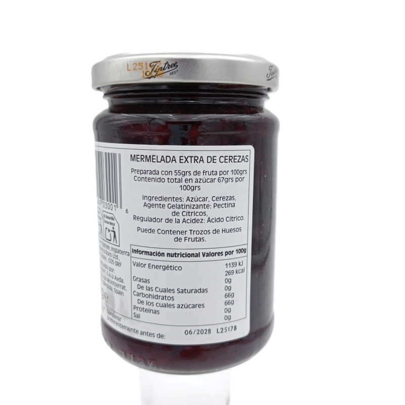 Ingredientes Azúcar, cerezas morello, gelificantes: pectina VALORES NUTRICIONALES % IR Valor medio por 100 gramos Valor energético 0,00 Kj/kcal. 0,00 Grasas: 0,00 de las cuales: Saturadas 0,00 gramos Monoinsaturadas 0,00 gramos Poliinsaturadas 0,00 gramos Hidratos de carbono: 67,00 Kj/kcal. 0,00 de los cuales: Azúcares 67,00 gramos Polialcoholes 0,00 gramos Almidón 0,00 gramos Proteinas: 0,00 gramos 0,00 Sal: 0,00 gramos 0,00 Fibra: 0,00 miligramos 0,00 Vitaminas: 0,00 nanogramos 0,00 Alérgenos Condiciones de conservación Almacenar a temperatura ambiente. Fabricante