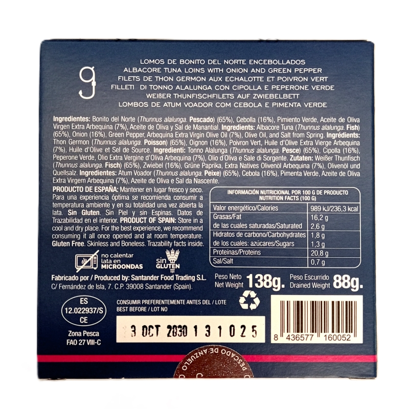 Bonito del norte, cebolla, aceite de oliva, vino, sal (PESCADO, SULFITOS).