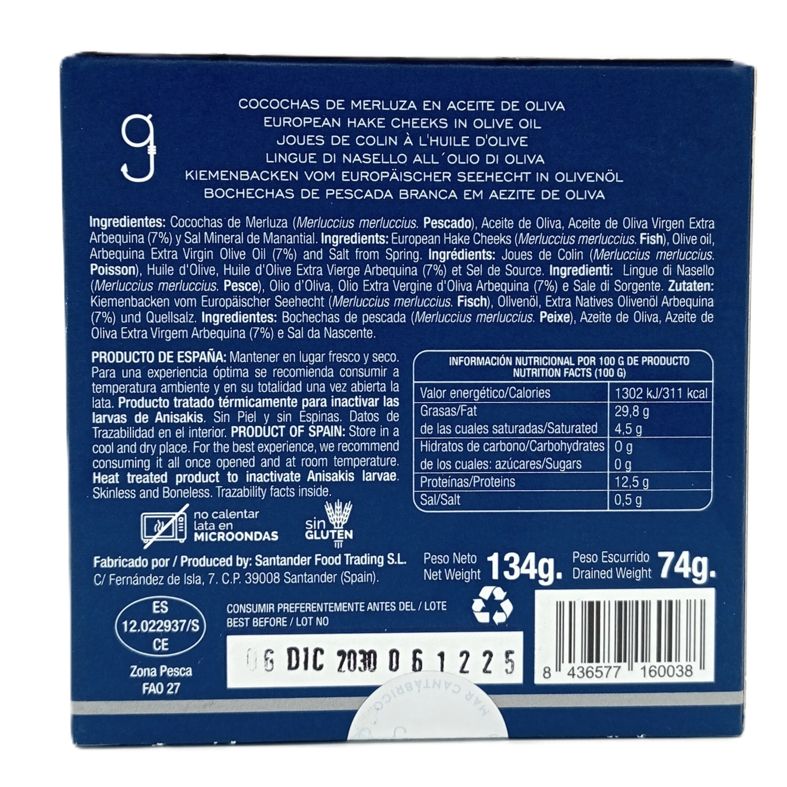 Cocochas de merluza (Merluccius merluccius), aceite de oliva virgen extra arbequina, sal mineral de manantial (PESCADO).