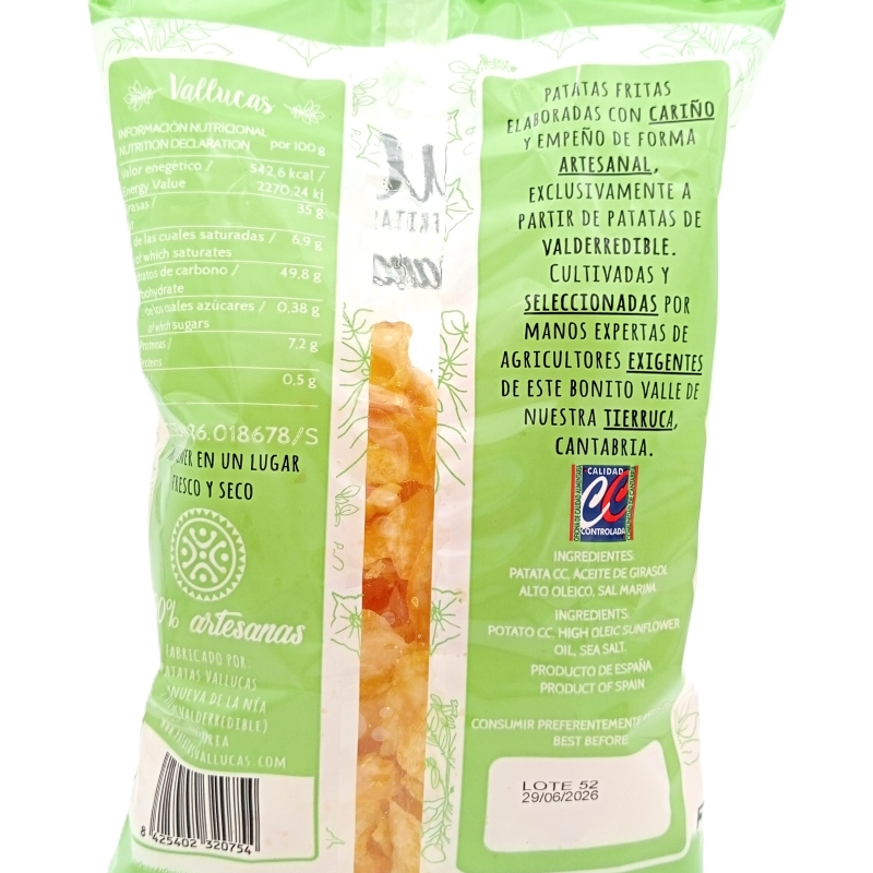 Sanas y artesanas. Son las dos palabras que mejor definen las patatas fritas vallucas. Artesanas porque están fritas con mucha paciencia. Y sanas porque para su fritura solo se usa aceite de girasol alto oleico. Y sanas porque, además, se elaboran con las mejores patatas para freir del mundo: las patatas de Valderredible. Cuentan con el sello de calidad controlada del Gobierno de Cantabria
