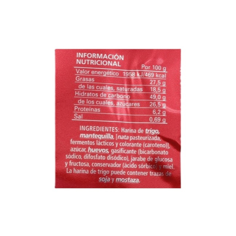 PruebaIngredientes VALORES NUTRICIONALES % IR Valor medio por 100 Valor energético 0,00 Kj/kcal. 0,00 Grasas: 26,38 de las cuales: Saturadas 0,00 gramos Monoinsaturadas 0,00 gramos Poliinsaturadas 0,00 gramos Hidratos de carbono: 44,14 Kj/kcal. 0,00 de los cuales: Azúcares 25,90 gramos Polialcoholes 0,00 gramos Almidón 0,00 gramos Proteinas: 5,11 gramos 0,00 Sal: 0,60 gramos 0,00 Fibra: 0,00 miligramos 0,00 Vitaminas: 0,00 nanogramos 0,00 Alérgenos Trigo, Margarina, Huevos Condiciones de conservación Vida útil de 60 días desde su fabricación. No es necesario mantenerlo refrigerado. Manenerlo en sitio fresco y no exponerlo a altas temperaturas sol y luz. Una vez abierto, consumir preferentemente antes de 15 días. Fabricante